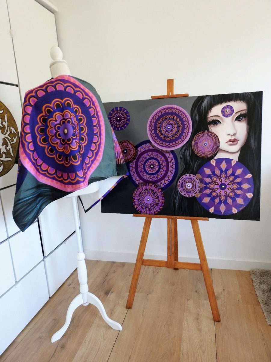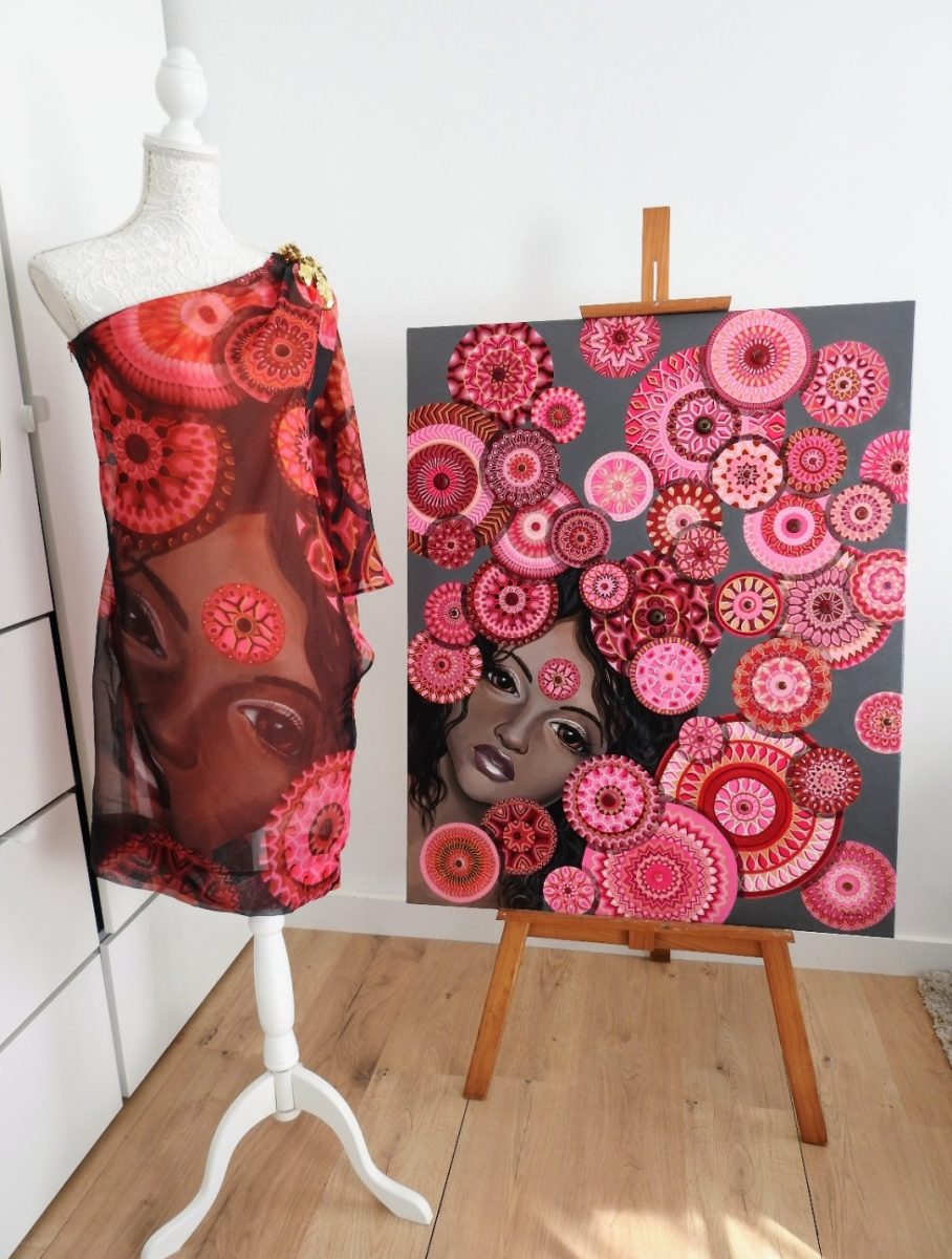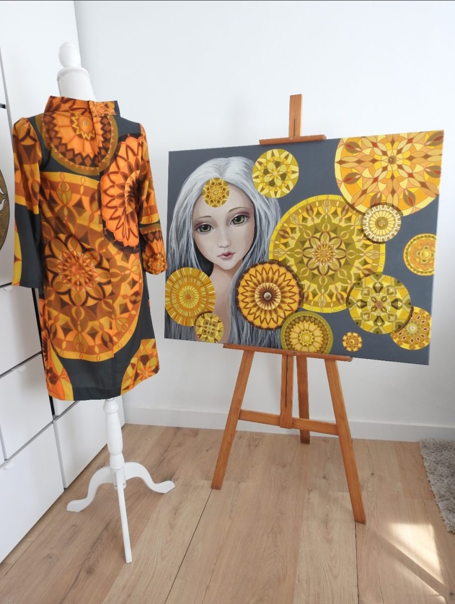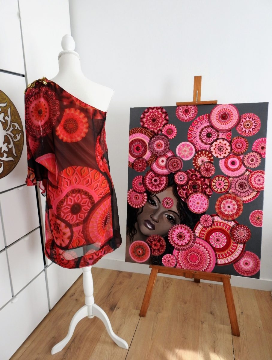 He querido representar todo el maltrato y el dolor como mujer maltratada inspirada en mi hija, la infancia, como muñecas rotas, medio vivas , medio inertes, la eterna dualidad de nuestro mundo y en todos los continentes . Los botones son recuerdo de infancia como hija de modista, son el nexo de union de la dualidad. Los mandalas son figuras geométricas meditativas, con un poder transmutador energético junto con el poder de los números y los colores, son los encargados de hacer la magia transmutadora y transformadora del dolor en paz y armonía. El agua de mar es vida, un cuadro está sin ella.
